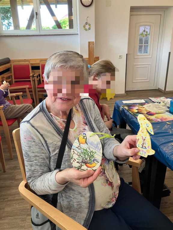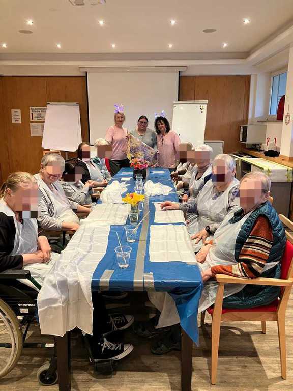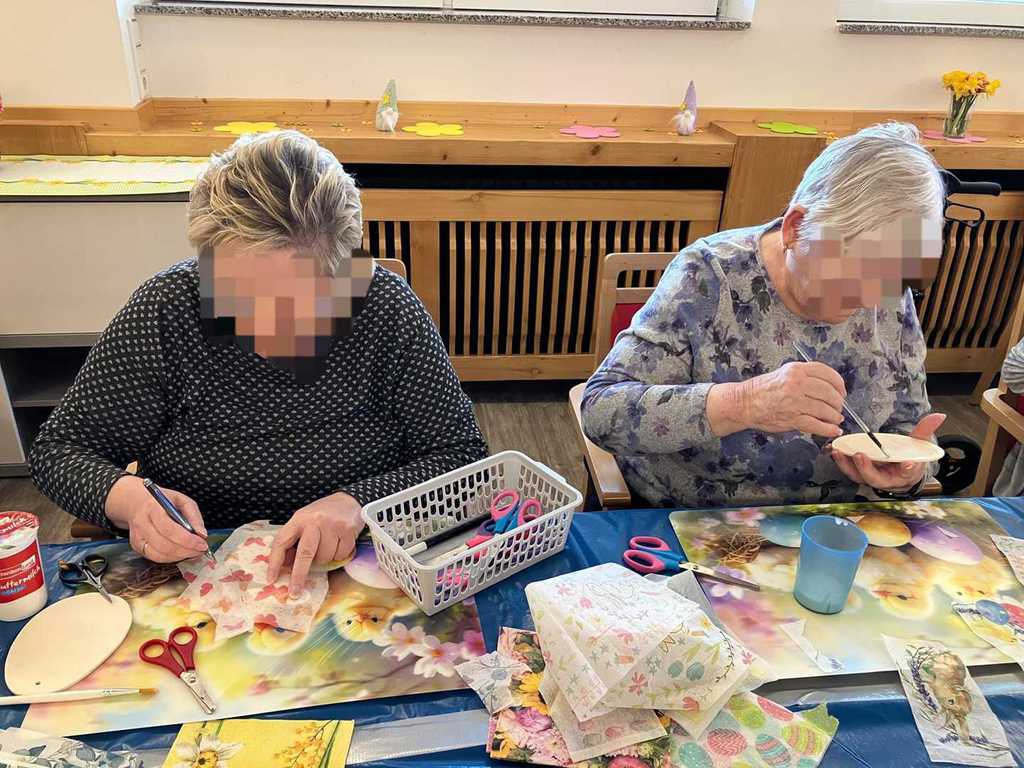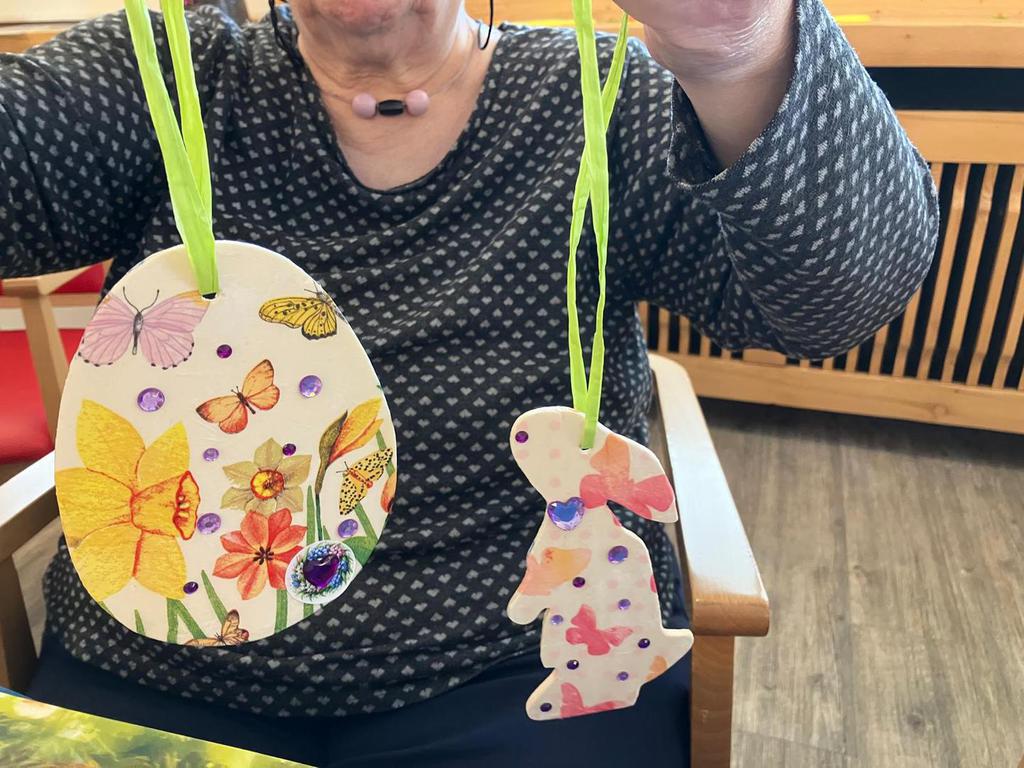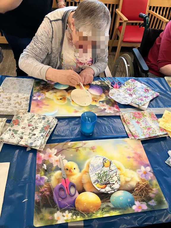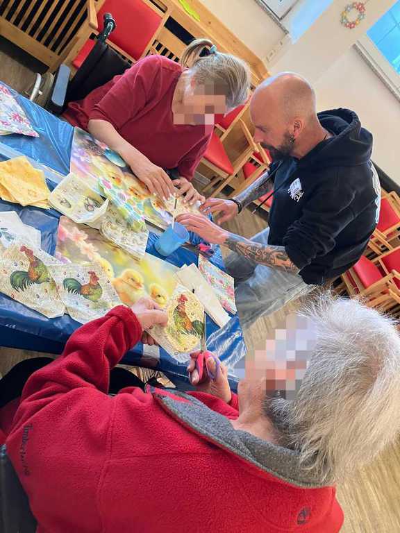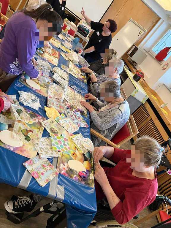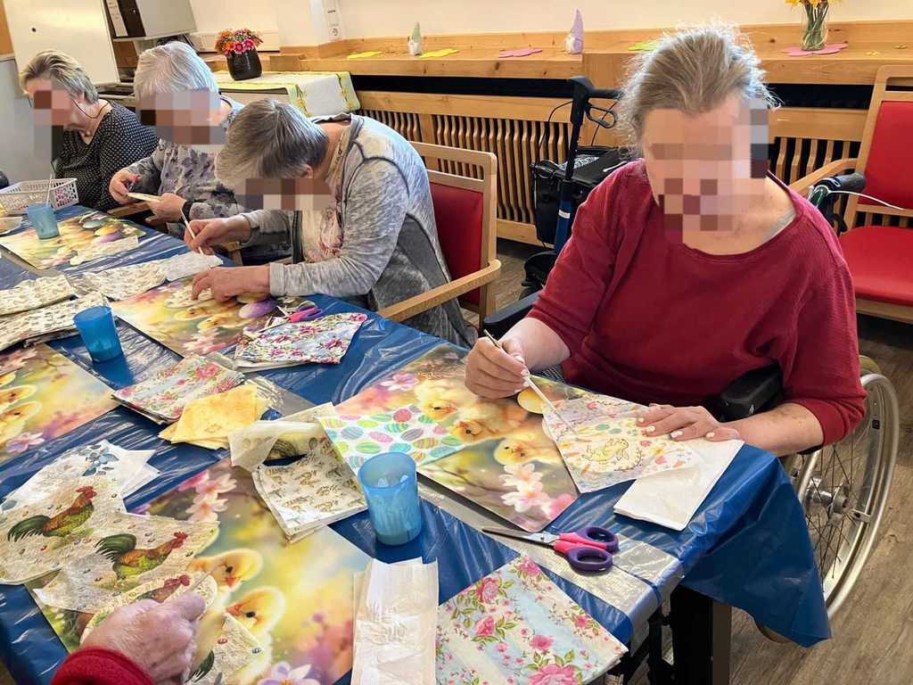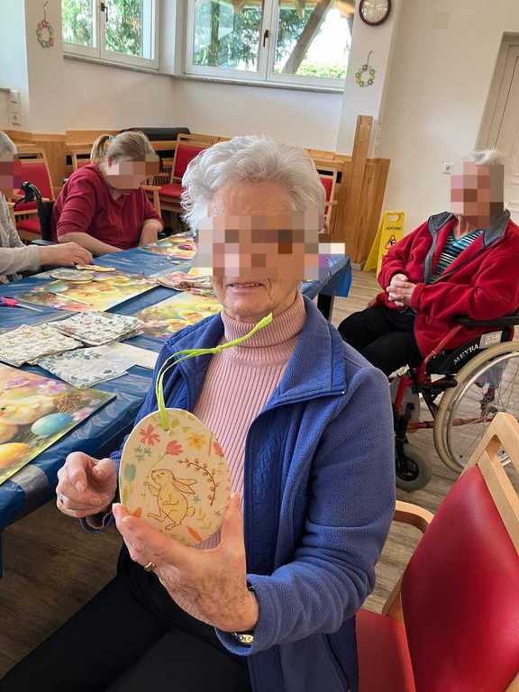 Am Vormittag wurde es kreativ: Mit viel Freude und Fingerspitzengefühl haben unsere Bewohnerinnen und Bewohner die Serviettentechnik ausprobiert. Entstanden sind wunderschöne Frühjahrs- und Ostermotive auf Sperrholz-Ornamenten – liebevoll vorbereitet in unserer Holzwerkstatt.
