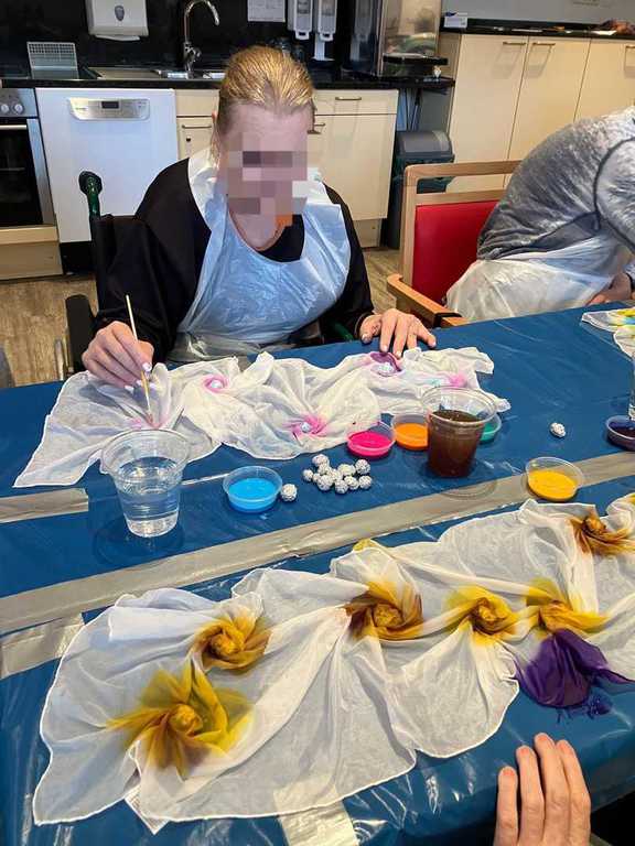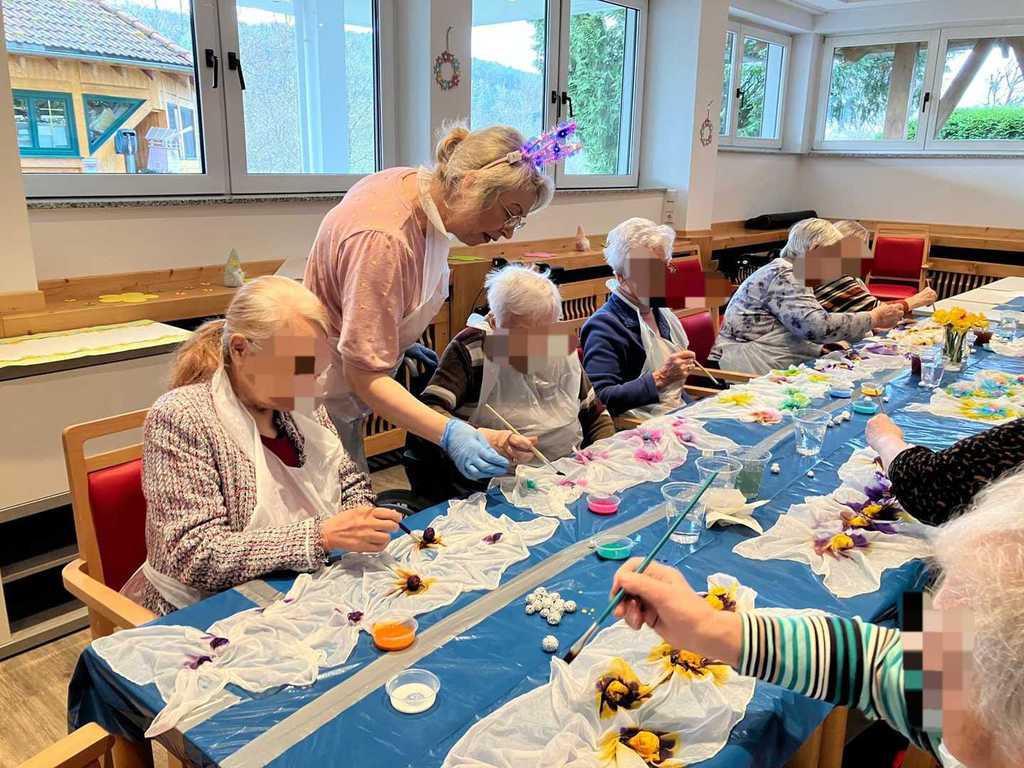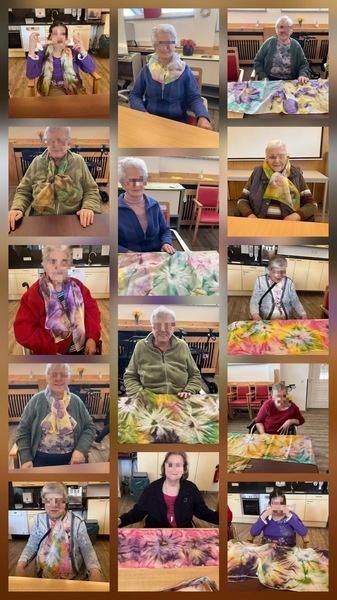 Heute wurde es kreativ: Unsere Bewohner im Pflegezentrum haben sich bei der Seidenmalerei mit viel Freude und Fantasie wunderschöne, frühlingshafte Seidenschals gestaltet.